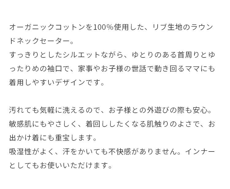 快適な着心地が自慢のラウンドネックのリブセーター。オーガニックコットンならではの滑らかで、柔らかい肌ざわりの着心地です。